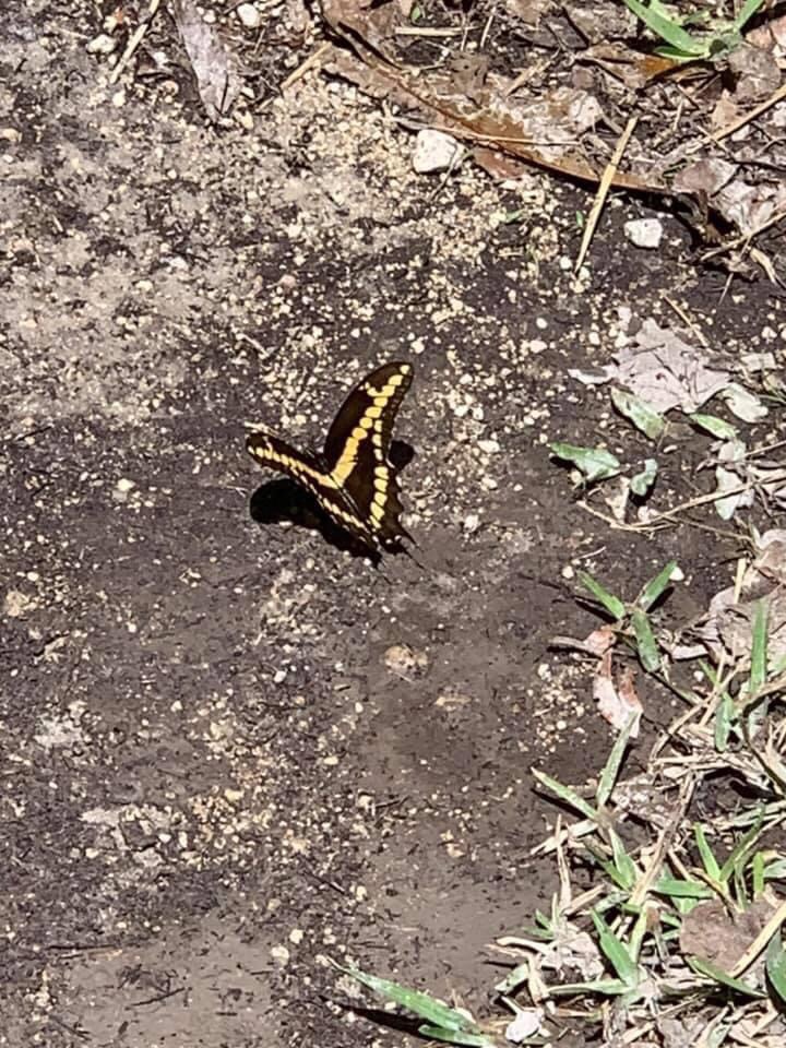 A fluttering swallowtail dances over the moistened soil
